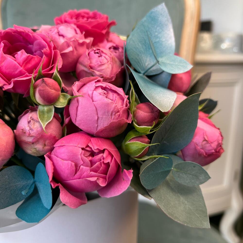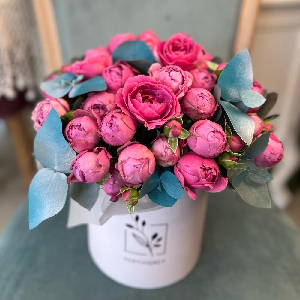 Композиция в шляпной коробке «Ягодный смузи» из пионовидных кустовых роз и эвкалипта в Абакане