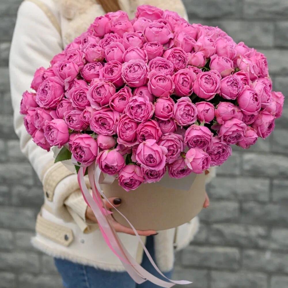Пионовидные розы Мисти Баблз в шляпной коробке (Размер L, 51шт) в Абакане